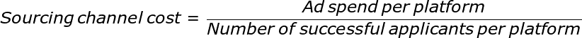 In order to calculate the cost-efficiency of the different sourcing channels recruiters include ad spend, the amount of money spent on advertisement. The sourcing channel cost per hire is measured by dividing the ad spend with the number of visitors who successfully applied through the job opening.