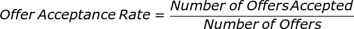 Taken as a percentage, this rate represents the percent chance that someone will accept a job offer from your company. For example, if you extend 10 offers within a given year, and 7 candidates accept those offers, your offer acceptance rate would equal 70%. Typically, the higher this number is, the better.