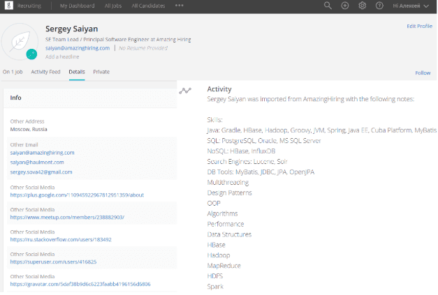 The candidate profile in Greenhouse will be enriched with information from AmazingHiring: candidate’s contact details, technical skills, current location and links to accounts on developers’ resources and social networks.