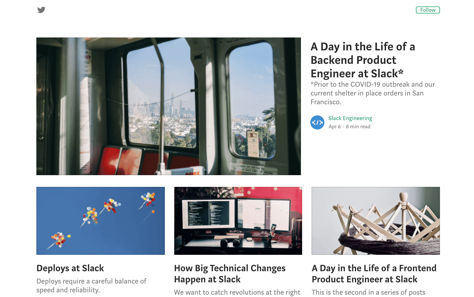 The basic content marketing strategy for a small or medium-sized company may look like this. In the first step, you should launch your corporate blog on a website. Here you can post in-depth articles on the technology you use, complex tasks your engineers solve so that people could get excited about the job. You can google some engineering blogs of companies you like to get some inspiration. For example, here is how Slack Engineering blog looks like. You can do a similar one.