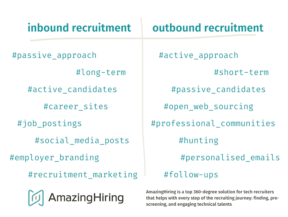 On the other hand, inbound recruiting is a relatively passive way of attracting talents. This strategy relies on improving recruitment marketing, employer branding, and positioning through social media, career sites, and job boards. This technique is designed to attract a constant flow of incoming candidates to apply for a company’s open positions. In other words, it is more of a slow burn. Additionally, while the company works on its inbound strategy, it still needs candidates right now, sometimes even yesterday.