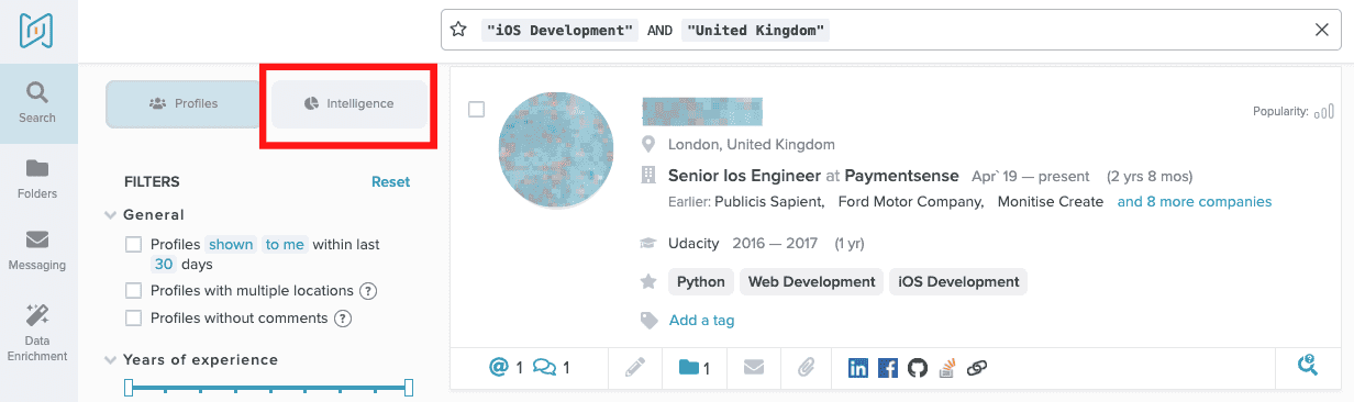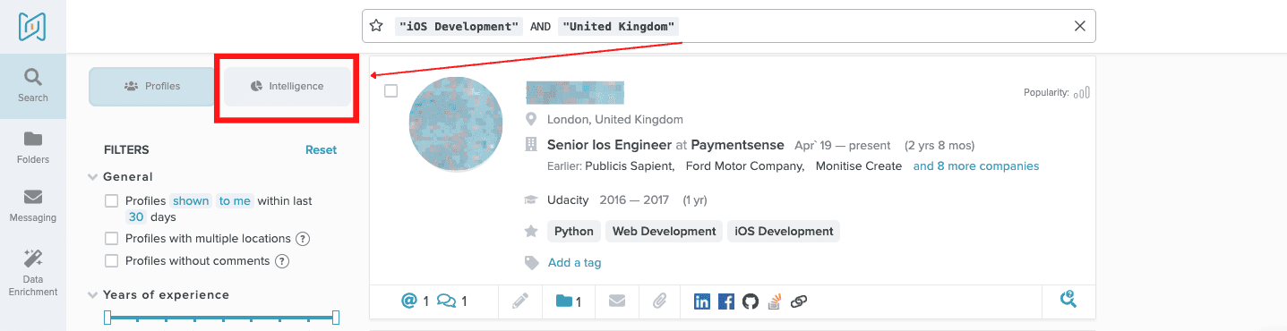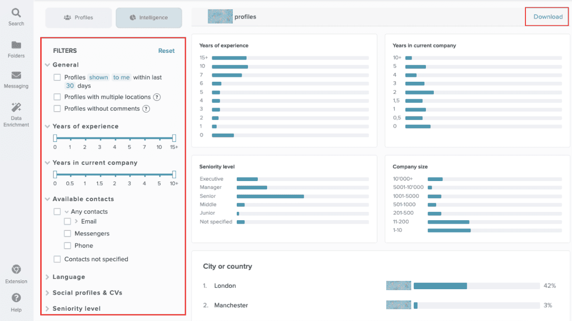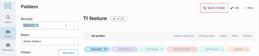 Open your folder and press the “Search new candidates” button. Then reset the filters on the left and go to the “Intelligence”. This way you will get an understanding of how the remaining talent pool looks and update and improve your strategy.