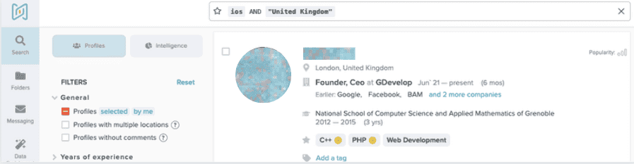 Having discussed the potential outcome with your hiring manager, start sourcing in AmazingHiring based on the info from Talent Intelligence. For example, you can start with the most specific search and target professionals from top employers in the industry. Or if you are working for a startup, you might want to target those with similar working experience. No worries, after screening the candidates’ profiles and adding them to your folder, you can exclude them and continue sourcing.