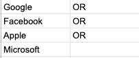 Answer: Use the “OR” builder in spreadsheets to make a company list.